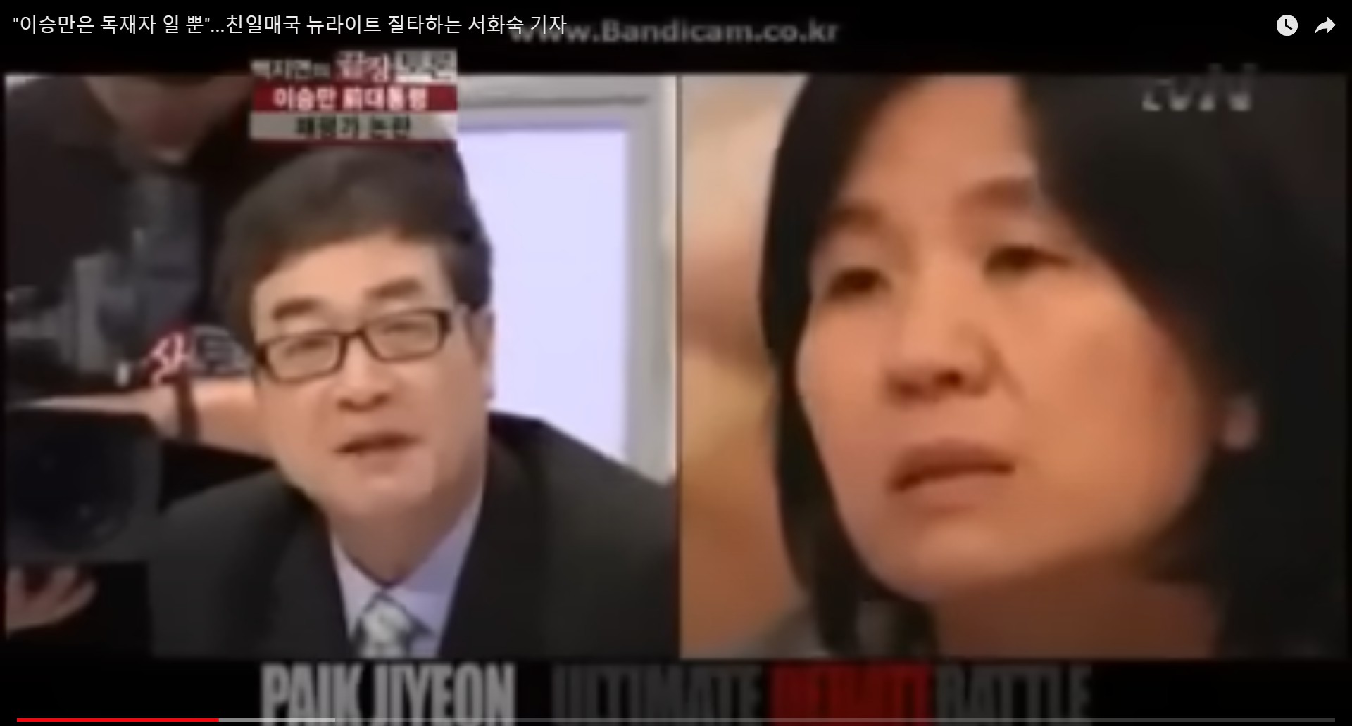 2011년 이명박 정권때 친일매국 집단 뉴라이트에 의해 이승만 재평가와 동상 건립 등을 추진하고 나와 역사관련 시민단체와 갈등을 빚고 있을 당시 한국일보 서화숙 대기자가 뉴라이트들을 질타하는 시원한 tvN 끝장토론 내용 입니다.