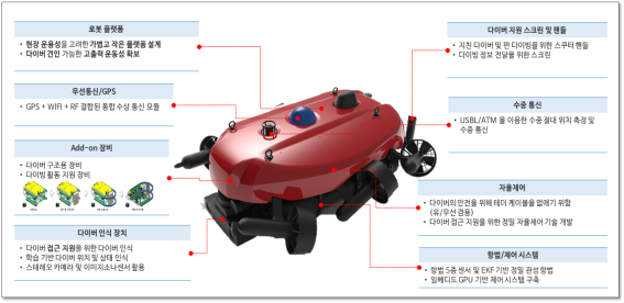 먼저, 안전 지원 로봇은 선박에서 혹은 다이버가 직접 핸들링하기 편하도록 소형 및 경량화된 형태로 설계되었다. 최종적으로는 한 명이 쉽게 물에 넣고 회수할 수 있는 수준으로 작고 가볍게 만드는 것을 목표로 개발 중이다. 또한, 다이버의 위치와 상태를 모니터링하기 위한 다이버 인식 장치가 장착되어 있다. 광학카메라와 음파 카메라를 함께 사용하여 물이 흐린 경우에도 다이버를 모니터링하는 게 가능하다. 스크린 및 핸들은 다이버가 수중상황을 쉽게 파악할 수 있도록 화면을 통해 정보를 제공하며, 다이버가 로봇을 스쿠터처럼 직접 잡고 운용할 수 있도록 해준다. 로봇은 수중에서 자율적으로 움직이면서 다이버를 지원하며, 이를 위한 제어 및 항법 시스템을 갖추고 있다. 수중에서는 무선통신이 매우 제한적이며, 따라서 원격으로 조종하기 위해서는 테더 케이블이 연결되어야 하는데, 케이블 자체가 다이버의 안전에 위협이 될 수 있기 때문이다. 또한, 다양한 해양 활동을 지원할 수 있는 장비를 로봇 하단에 추가로 장착할 수 있는 구조도 갖추고 있다.