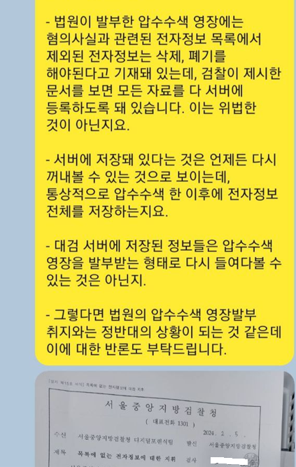 지난 2월 7일 오후 6시 2분 대검 대변인실의 부대변인과 통화가 이뤄졌을 때 “이진동 대표의 휴대전화 압수와 관련, 혐의와 무관한 ‘휴대전화 정보 전체를 저장한다’는 내용이 담긴 검찰의 수사지휘서가 위법한 것 아니냐”고 물었다. 이에 대검 부대변인은 “그 내용이 어떤건지 서류를 받으신 거잖아요"라며 "(전화통화로) 듣기만 하니까 그 서류 내용을 정확히 잘 모르겠다”고 말했다.
