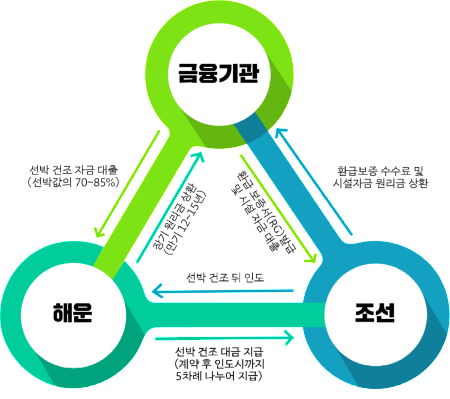 특히 해운기업이나 조선소 등 해양 기업들은 소요자금의 약 60%를 은행에서 대출 형태로 조달하고 있으며 나머지는 자본시장에서 주식이나 채권 발행 등을 통해 확보하고 있다. 이러한 자금조달 패턴을 보유하다 보니 해운기업의 재무구조는 다른 산업에 속한 기업에 비해 부채비율이 높게 나타나 재무위험 노출이 큰 것으로 보고되고 있다. 특히 선박의 경우는 수요자 즉 해운기업이 건조계약 단계부터 인도할 때까지 통상 5번에 나눠 자금을 미리 조선소에 지불하고 있는 점이 특이하다. 이러한 관계로 인해 조선소는 선수금환급보증(refund guarantee)을 금융권으로부터 발급받아야만 최종 계약이 성립된다.