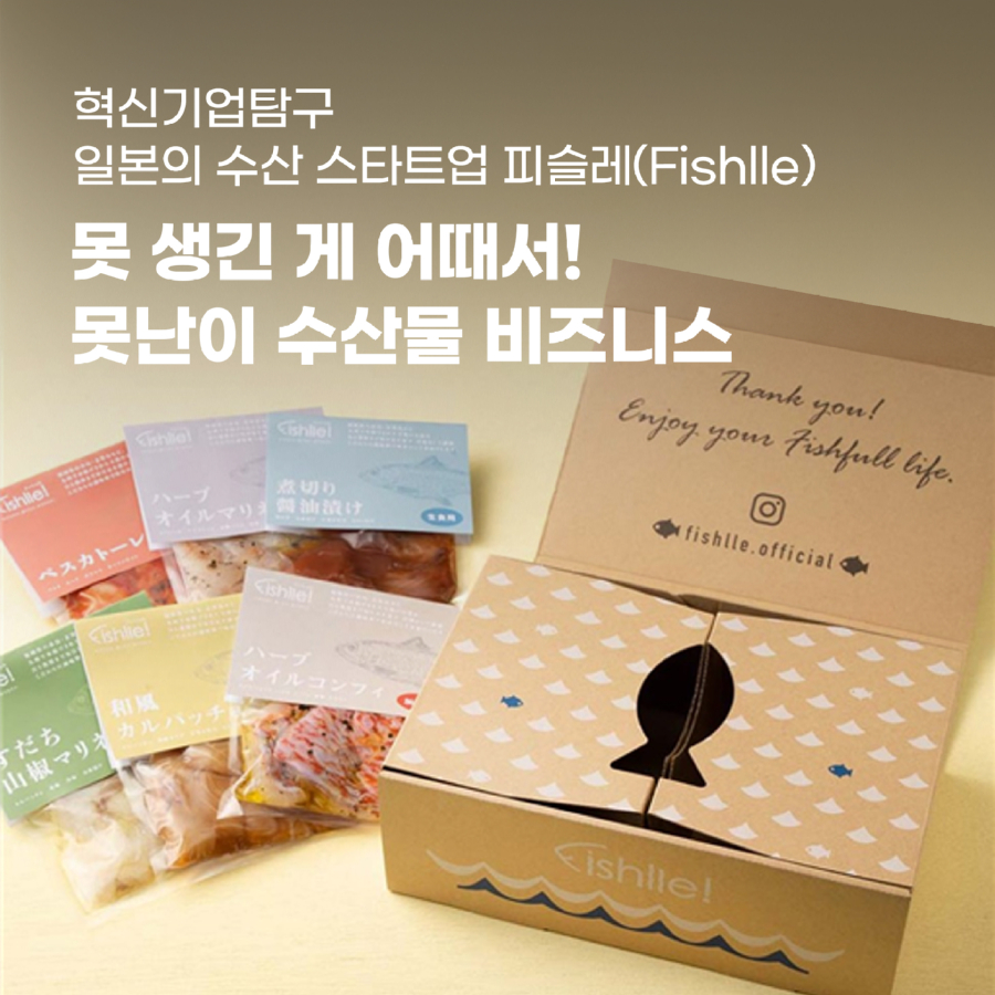 일본에서는 못난이 수산물로 밀키트를 만들어 성공 가도를 달리는 기업이 등장했다. 일본 후쿠오카에서 2022년 6월에 이구치 고시 대표가 창업한 피슬레(fishlle)다. 이 회사는 일본 연안에서 잡히는 못난이 수산물(일본에서는 미 이용어<未利用魚, monaitai 등으로 부름>)을 밀키트로 개발해 온라인 플랫폼(www.fishlle.com)을 통해 판매한다. 비즈니스 모델은 월 1회씩 제공되는 밀키트 구독 서비스가 핵심이다. 본래 이구치는 미국 유학에서 돌아와 2018년부터 벤너스라는 회사를 운영했다. 할아버지와 아버지가 대를 물려가면서 사는 후쿠오카 시가 섬에서 어획한 못난이 생선을 소비자(기업)에게 직송하여 파는 B2B 회사였다. 문제는 2019년 10월부터 시작한 이 사업이 반년도 되지 않아 커다란 난관에 봉착했다는 점이다. 코로나가 일본 전역에 확산되면서 그 동안 개척했던 외식업체들이 하나둘씩 문을 닫으면서 판매량이 뚝 떨어졌다.