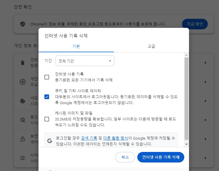 2. 크롬 : 인터넷 사용기록 삭제 --> 쿠키 및 기타 사이트 데이터 삭제 후 이용