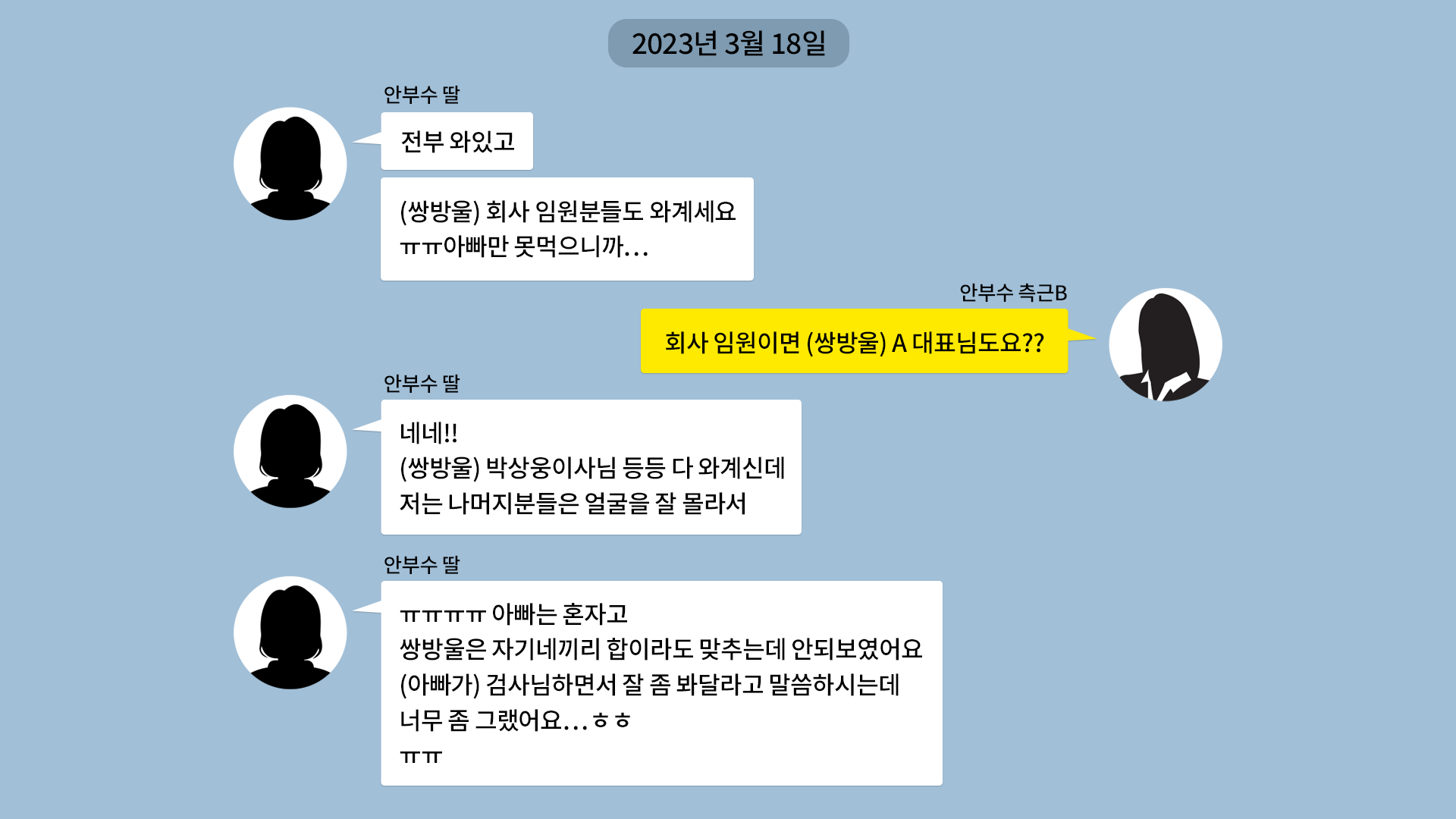 안부수 회장의 딸과 측근 B씨의 카카오톡 대화 내용 중. 2023년 3월 18일에 오간 대화다. 원자료에 있던 오타는 수정하지 않았고, 괄호 안 내용은 편집자가 추가했다.