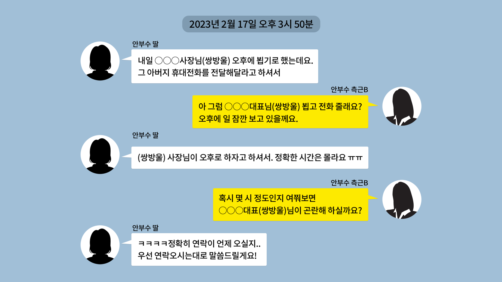 안부수 회장의 딸과 측근 B씨의 카카오톡 대화 내용 중. 2023년 2월 17일에 오간 대화다. 원자료에 있던 오타는 수정하지 않았다.