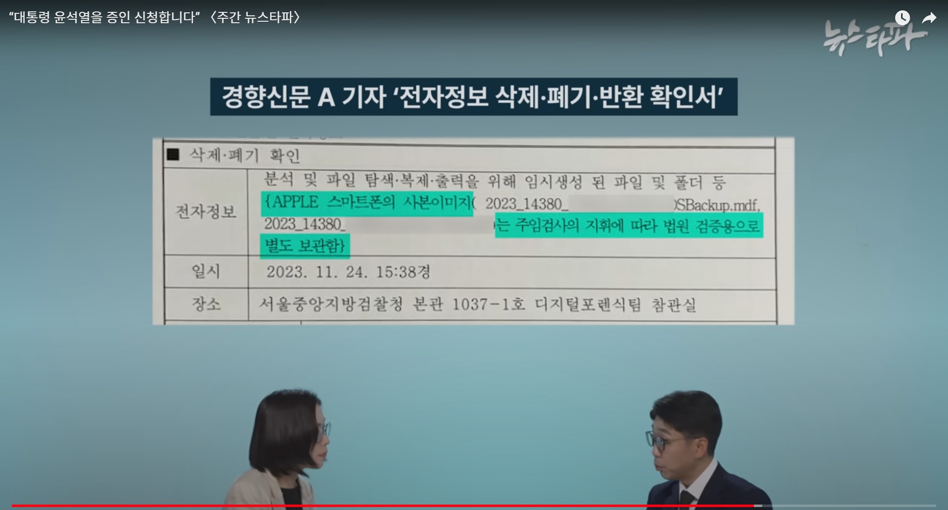 "아무런 설명 없이 삭제폐기반환확인서를 교부할 때 압수목록을 슬쩍 끼워줬기 때문에 당시에 불법 압수 사실을 바로 알아차리기 힘들었어요. 법률이 아닌 대검 예규 따위로 피의자의 전자정보를 검사 마음대로 전체 저장할 수 있게 하는 것이 문제라고 봅니다."- 뉴스타파 봉지욱 기자
