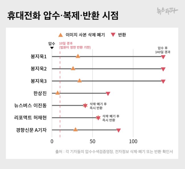 지난해 9월 14일 압수수색으로 휴대전화를 빼앗긴 뉴스타파 한상진 기자는 ‘압수물 선별’(포렌식)이 끝나고 62일이 지난 11월 22일에야 휴대전화를 돌려받았다. 뉴스타파 봉지욱 기자, 리포액트 허재현 기자, 경향신문 기자, 뉴스버스 이진동 대표도 비슷했다. 이들 5명의 기자가 휴대전화를 돌려받은 때는 압수수색을 당한 날을 기준으로 평균 94일이나 됐다. 법원 규정인 10일보다 10배 가까이 긴 시간이었다. 휴대전화 포렌식을 한 날을 기준으로 봐도 62일이나 됐다.