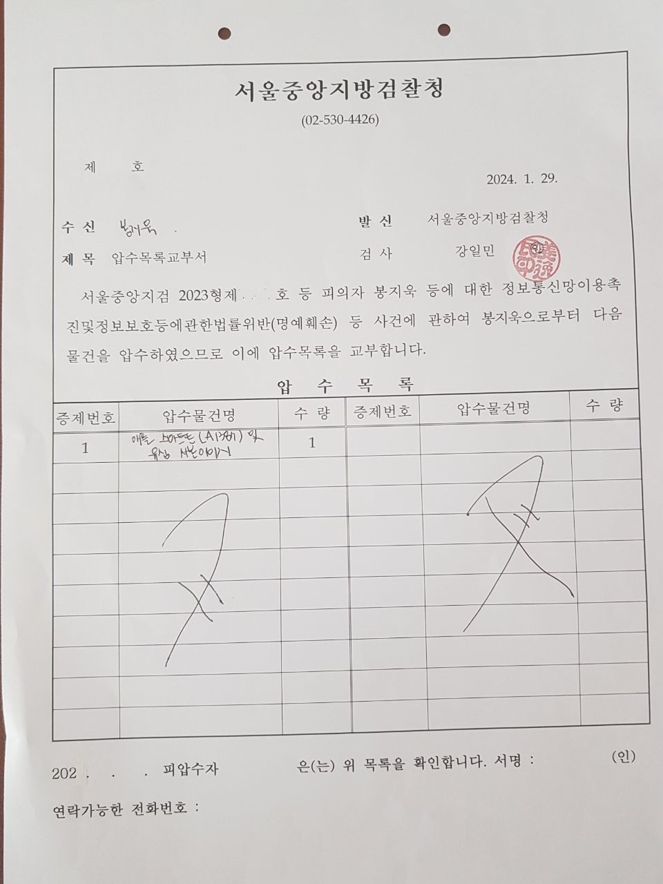 그런데 같은 날 검찰은 봉 기자에게 삭제폐기반환확인서를 교부하면서 새로운 압수목록교부서를 같이 준 것으로 확인됐다. 교부서에는 삭제폐기 후 반환한 휴대전화(애플 스마트폰(A1387) 및 유심 사본이미지)가 압수 목록에 다시 들어 있었다. 봉 기자의 이름이나 서명도 없는 문서였다.