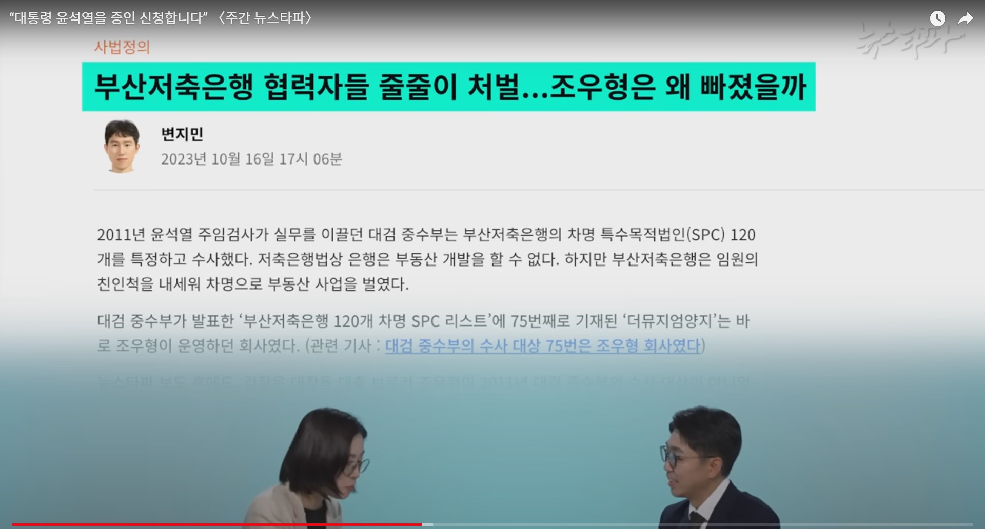 부산저축은행 차명 SPC 관계자들은 당시 수사 대상이 아니었다는 것이다. 이 또한 사실이 아니었다. 이날 재판에서 뉴스타파 측 신인수 변호사는 조우형과 비슷한 역할을 했던 부산저축은행 차명 SPC의 임원들이 어떤 처벌을 받았는지 구체적으로 설명했다. 자세한 내용은 2023년 10월 16일자 뉴스타파 기사 <부산저축은행 협력자들 줄줄이 처벌...조우형은 왜 빠졌을까>에서 확인할 수 있다.