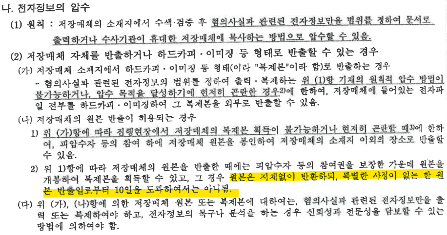 현행법에 따르면, 수사기관은 전자정보를 압수수색 할 때 가능한 압수수색 현장에서 압수와 압수대상물 선별 절차를 마쳐야 한다. 법원이 발부한 압수수색검증영장에는 ‘압수 대상 및 방법의 제한’에 대해 아래와 같은 ‘원칙’이 기재돼 있다.