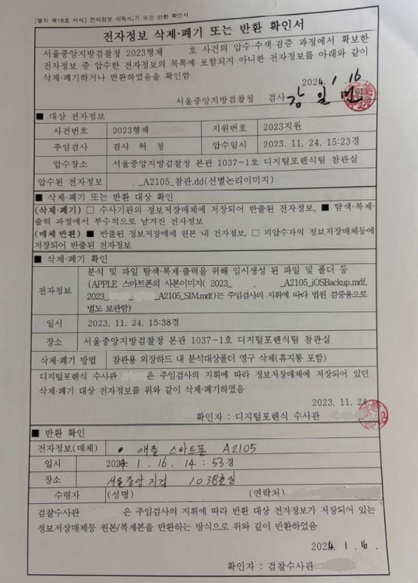 A 기자가 검찰로부터 받은 삭제폐기반환확인서를 보면, '(경향신문 A 기자 소유의) 아이폰 사본이미지는 주임검사의 지휘에 따라 법원 검증용으로 별도 보관함'이라고 적혀 있다. A 기자 휴대전화에 저장된 모든 정보를 대검 서버 ‘디넷’에 업로드했다는 말이다.