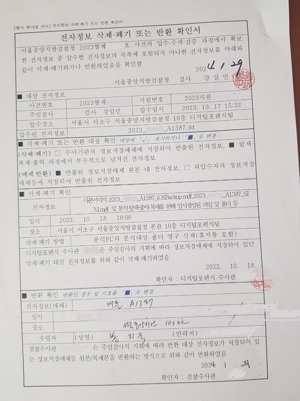 지난 1월 29일 뉴스타파 봉지욱 기자가 받은 애플 A1387 휴대전화에 대한 전자정보 삭제·폐기 또는 반환 확인서.