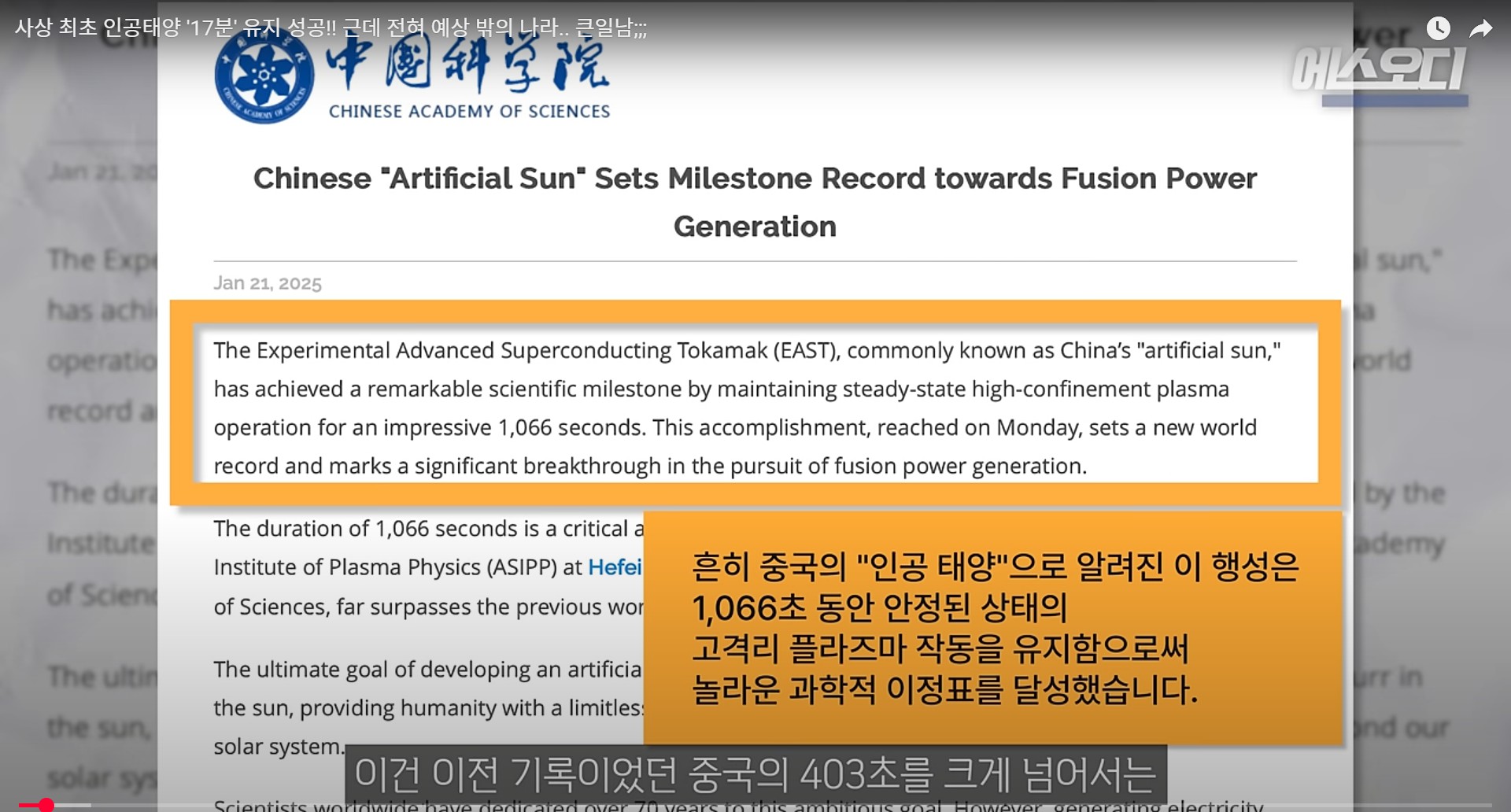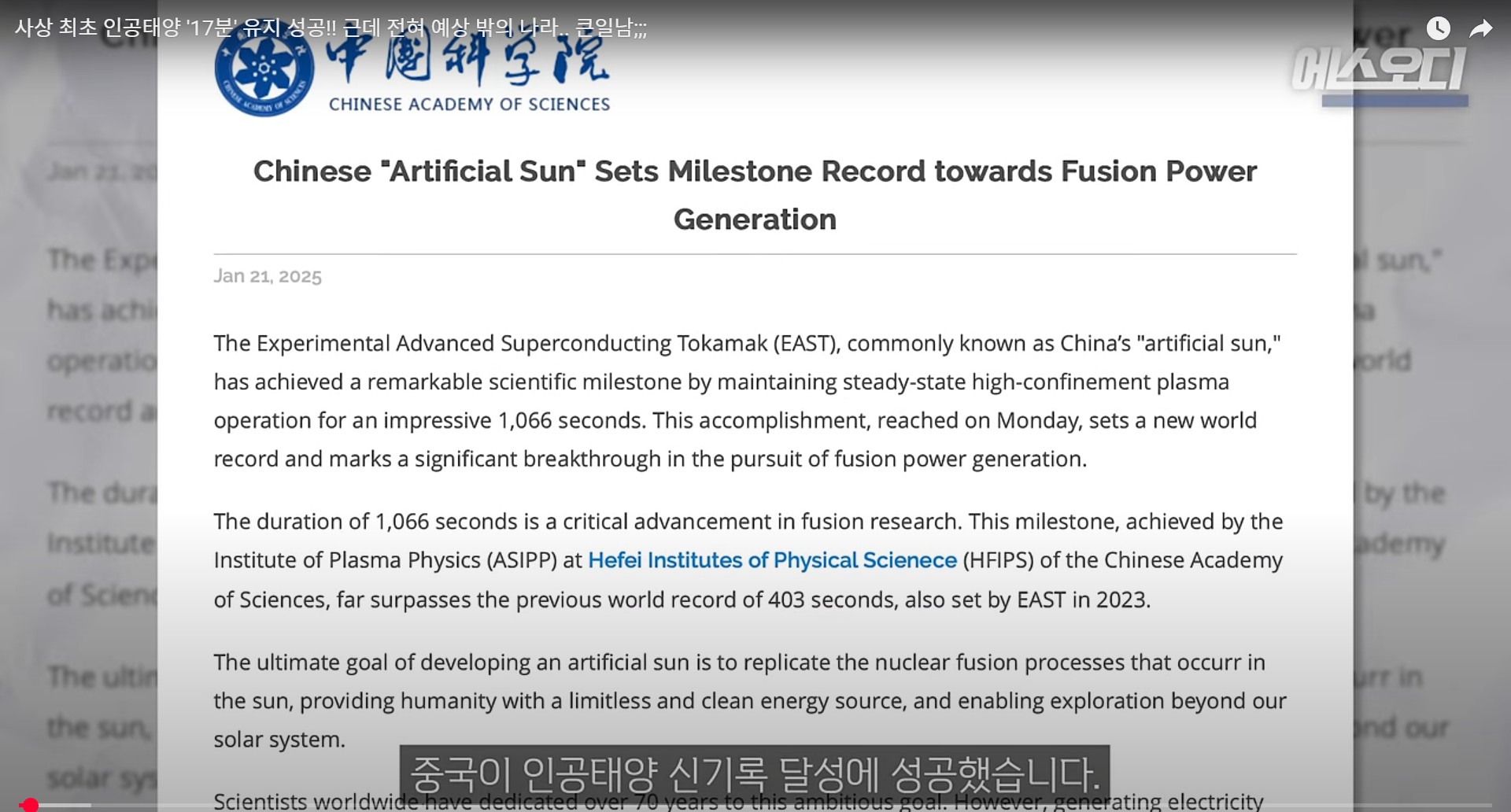 중국이 인공태양을 1066초 유지에 성공하며 핵융합 상용화에 다가섰습니다...!