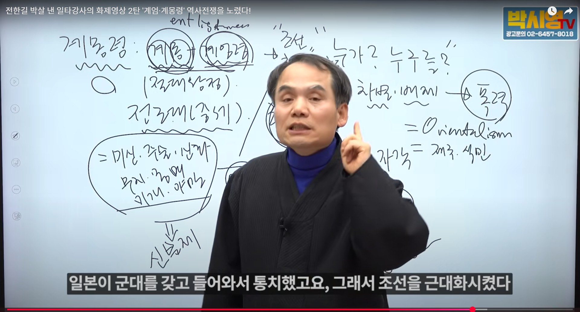일본이 군대를 갖고 들어와서 통치했고, 그래서 조선을 근대화 시켰다.
