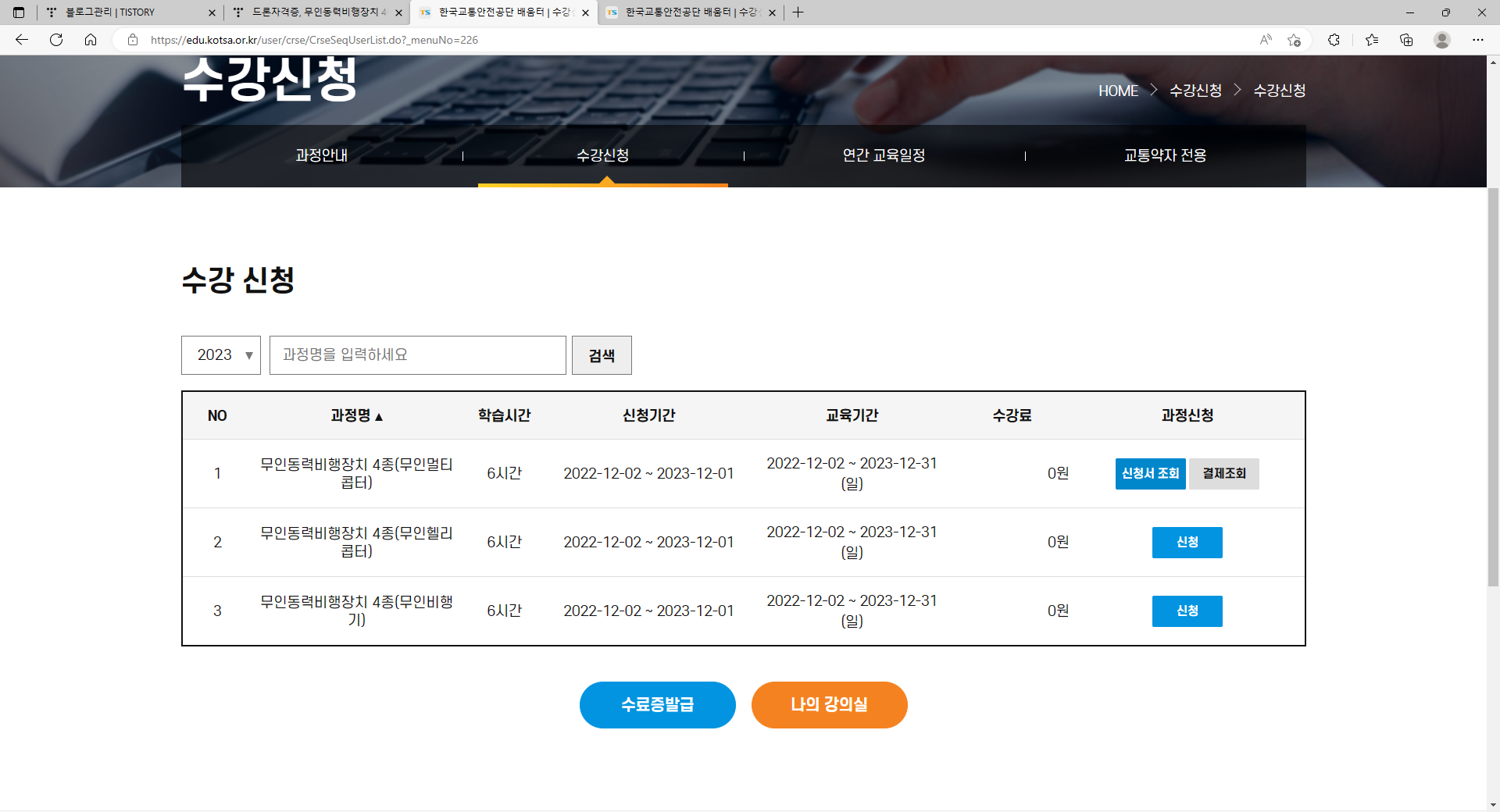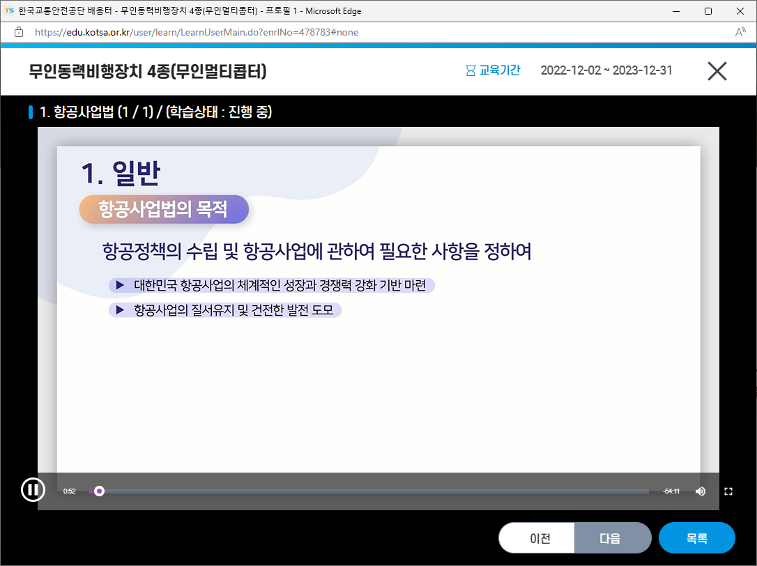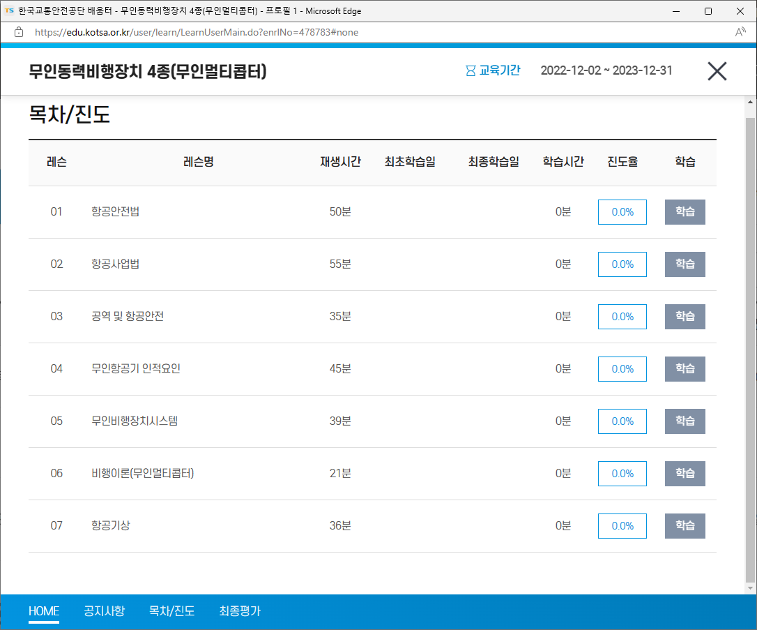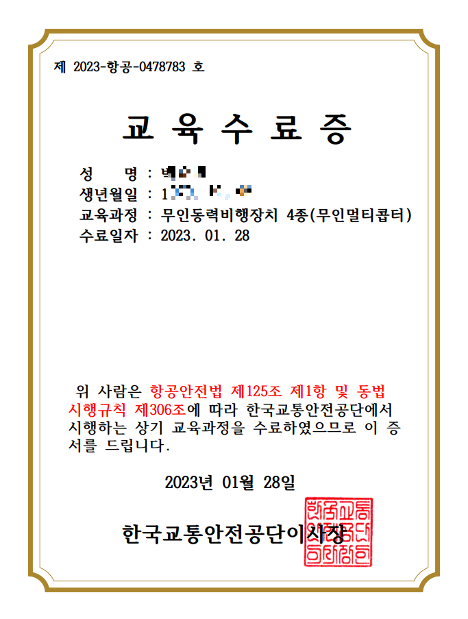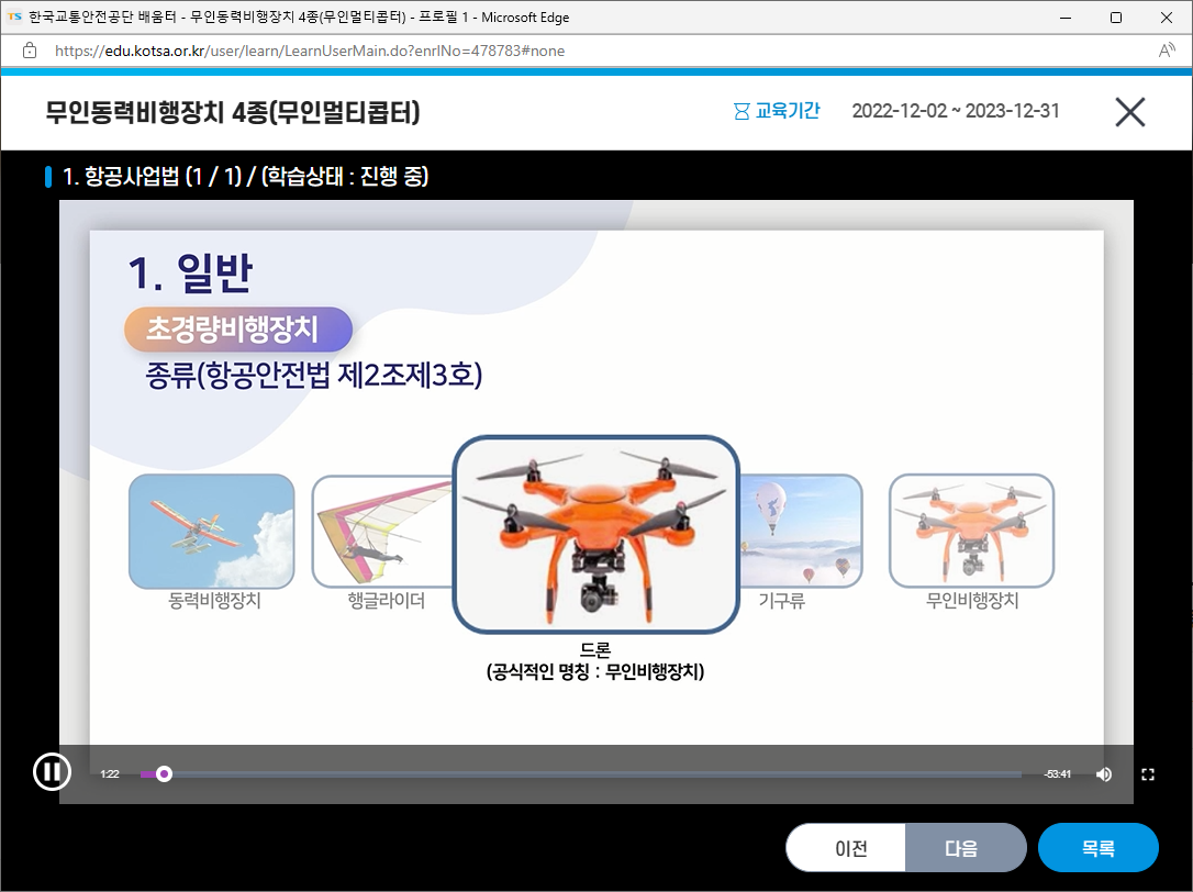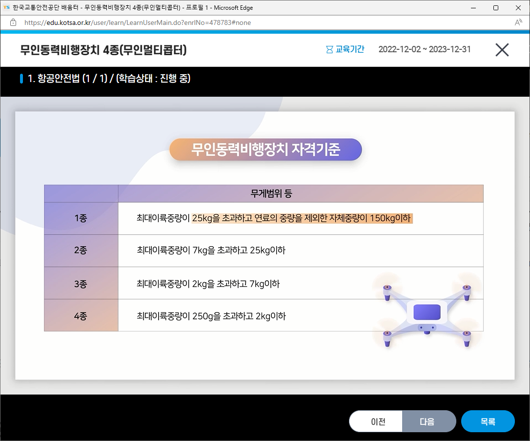 많은 분들이 취득하시고자 하는 드론자격증 4종(무인동력비행장치4종) 강의가 2022년 12월 2일부터 2023년 12월31일까지 오픈되었습니다.