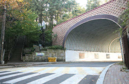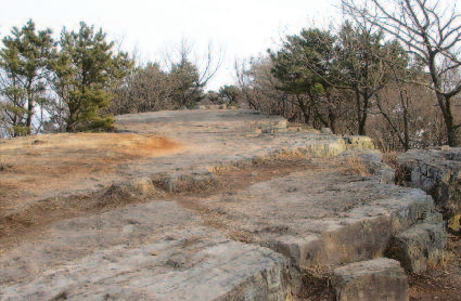 길가 정자쉼터 건너편 등산안내판 옆 계단을 따르면 길은 가팔라진다. 소나무가 있는 넓은 쉼터에서 잠깐 숨을 돌리고 나면 잡목지대의 된비알이 계속된다. 10 여분을 올라 큰 소나무쉼터를 지나면 이번에는 바위가 앞을 가로막는다. 오른쪽의 바위 사이로 오르던 옛길은 나무계단으로 바뀌었다.