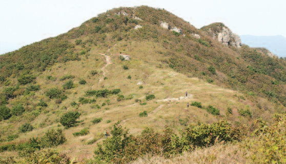 첫 봉우리에서 6분 정도라야 끝 봉에 올라설 수 있고 거기서 3~4분이면 사배고개와 고당봉으로 가는 길이 갈라지는 펑퍼짐한 능선을 덮은 억새밭에 내려선다.