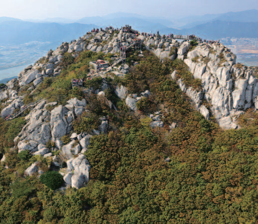 방향을 동쪽으로 바꿔 가다 보면 넓적한 덕석바위를 지나 곧 봉우리 하나가 오뚝하게 앉아 있다. 고당에 이름을 빼앗기고 멀리서 자기 몸체를 바라보고 있는 금정봉(쇠미봉)이다.