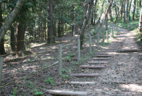 산불방지초소 쪽으로 방향을 바꿔 능선 오른쪽에 좁은 등산로가 있지만 이를 무시하고 순례길을 따라 가면 곧 경사가 심한 통나무 계단이 기다린다. 계단 아래가 만남의 숲이다.