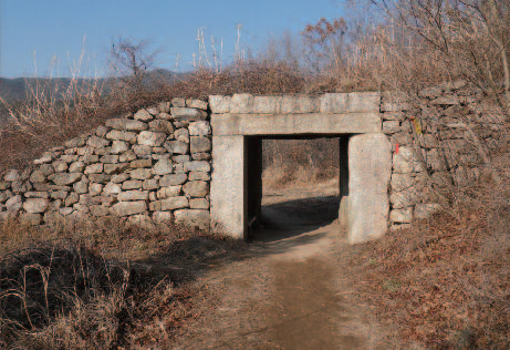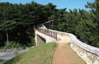 성과 가까워 졌다 멀어지기를 두어 차례 거듭하면서 10분 정도 내려가다 성이 북쪽으로 꺾이면서 성위에 올라서고 보면 자동차 소리가 들린다. 성과는 헤어져 오 른쪽으로 방향을 잡아 등산로에 올라서면 곧 왼쪽으로 방향을 잡아 내려가는 것이 도로에 내려서기 편하다. 도로 건너편에 이어진 성 안쪽의 돌계단을 따라 내려 가면 산성 17.337km 가운데 고도가 가장 낮은 해발 230m의 협곡에 서문이 있다.
