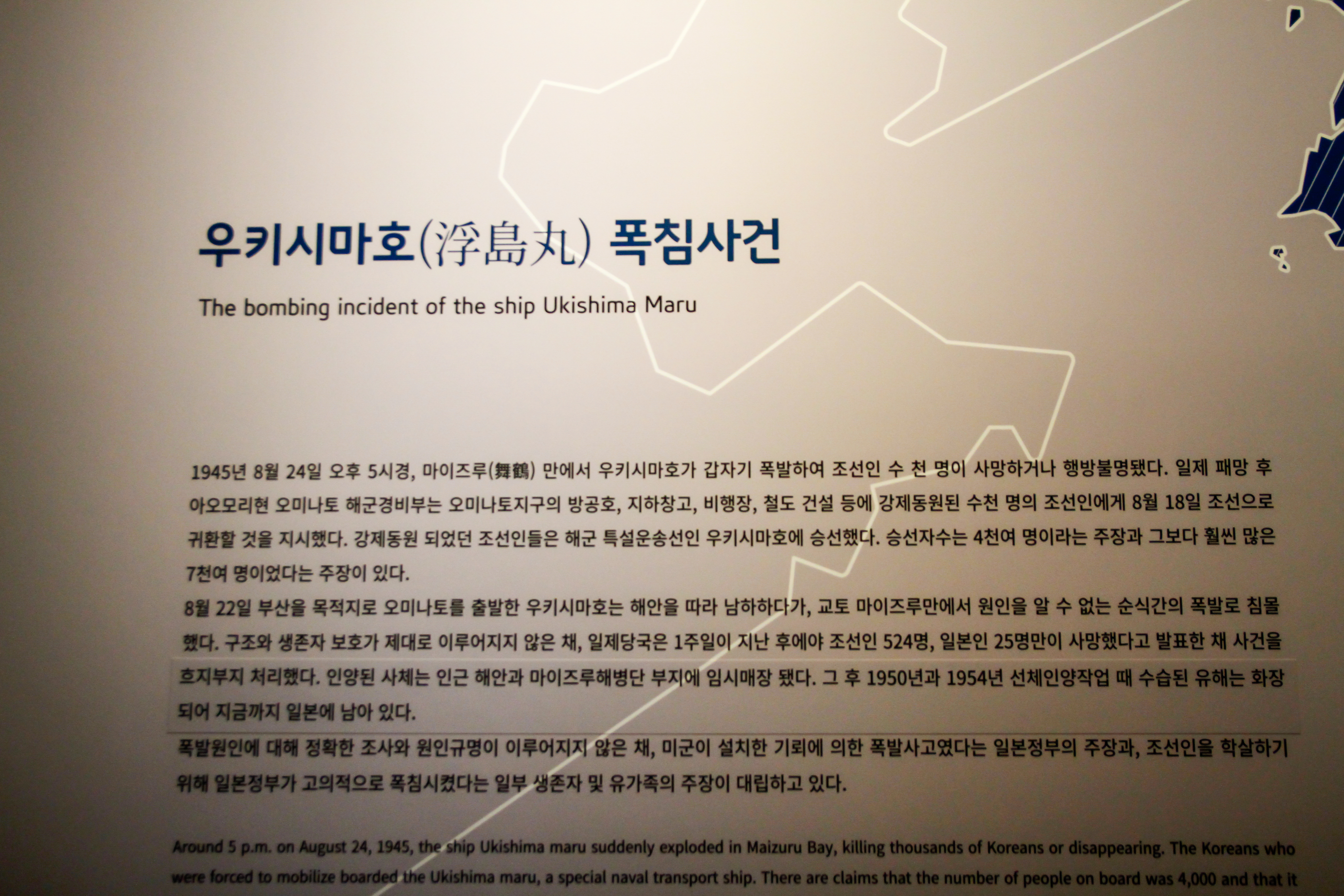 일제는 패전 사흘 뒤인 1945년 8월 18일, 일본 전범의 재판과 관련해 일어날지도 모를 재일 한국인들의 폭동을 우려하여 한국인 노동자를 부산으로 송환하라는 명령을 일본 해군을 통해 예하부대에 내렸다. 이러한 명령에 따라 강제 징용되었던 7,000여 명의 한국인을 태운 4,740t급 일본 해군 군함 우키시마호는 8월 21일, 일본 북동쪽에 있는 아오모리현[靑森縣]의 오미나토항[大溱港]을 떠났다. 그러나 부산항으로 향하던 우키시마호는 24일, 돌연 방향을 돌려 일본 중부 동해 연안에 있는 마이즈루항[舞鶴港]으로 들어갔는데, 이 때 갑자기 폭음과 함께 배가 폭발, 두 동강이 나면서 침몰하고 말았다.