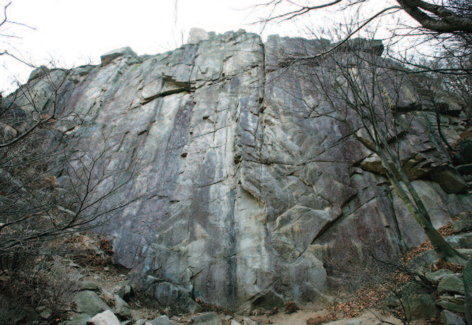 버스나 승용차로 산성고개까지 가면 바위는 5분 거리다. 가까이에 식수도 있다. 상·하단의 두 부분으로 나누어지는 이 암장은 초보자들이 즐길 수 있는 <쓰레기(5.9)> <기존A(5.7)>이 있는가하면 암벽대회 결승 루트였던 <축제 2(5.12b)>를 비롯해 <숲속의 빈터(5.12)> <PC9(5.12a)> <To You(5.12d)> 등 고수 클라이머들의 구미를 당기는 고난도 루트가 있고 모두가 함께 어우러질 수 있어 클라이머들 간에 인기가 높다.