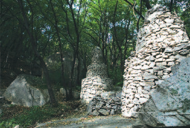 바위가 싫은 사람은 그대로 소나무 옆을 지나면 앞이 훤히 트이면서 오른쪽에 남향의 아늑한 묘지가 있고 앞에는 억새가 무성한 초원지대 저쪽에 성벽도 보인다. 묘지 앞을 지나면 곧 세 갈래길인데 오른쪽(서)으로 돌아 숲속을 5분정도 걸으면 제3망루와 제4망루사이의 성벽에 올라선다.