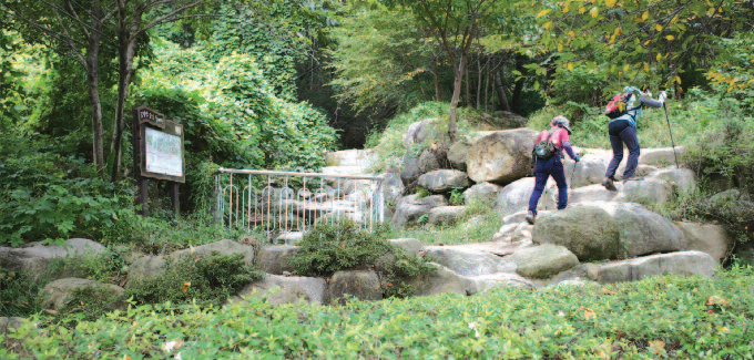 둘레길을 버리고 왼편으로 방향을 바꿔 오르면 주변에는 바위와 소나무가 많지만 등산로를 걷는데 어려움은 없다. 10분쯤 올라 만나는 좌우 갈림길에서 오른쪽길을 택하면 곧 개울을 건너 작은 능선을 넘어 5분쯤 걸으면 왼편에 너덜겅이 보인다.