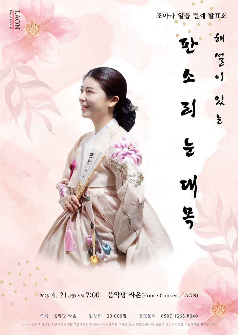 제39회 동래전국전통경연대회에서 대상(국회의장상)을 수상한 바 있는 소리꾼 조아라님이 이번 공연에서는 어렵게만 느껴지는 판소리를 이해하기 쉽도록 소리와 해설을 통해 관객과 소통하며 모두가 즐길 수 있는 시간을 가집니다.
