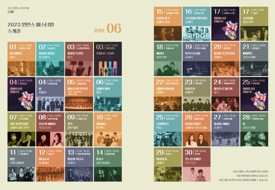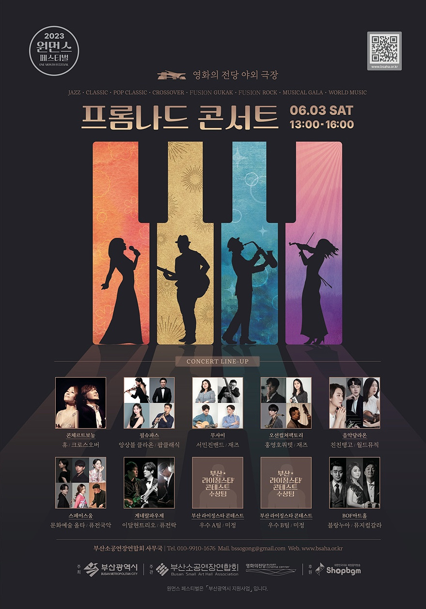 2. 영화의전당과 공동주관하는 프롬나드콘서트로 야외극장에서 총 10팀이 열린음악회를 하면서 한 달간의 원먼스페스티벌을 홍보하는 행사,