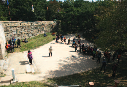 다시 30m 오르면 바위가 앞을 막으면서 길은 좌우로 갈라진다. 남쪽으로 돌아가 면 내리막길에 접어들면서 네거리가 된다. 계속 서쪽으로 방향을 잡아가면 묘지 3 기를 차례로 지나 얼마 안 되어 왼편으로 절집이 보이면서 휴정암 가는 길이 갈라진다. 서쪽으로 방향을 잡으면 곧 비포장도로와 만나게 된다. 케이블카승강장이 나 남문마을은 남쪽으로, 제2망루를 거쳐 동문은 북쪽으로 가면 된다. 서쪽의 남문까지는 10분의 거리다.