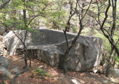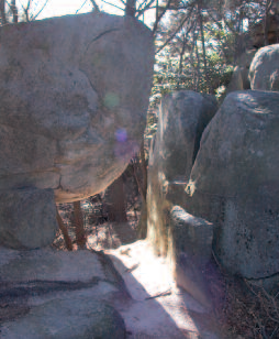 선바위에서 남쪽으로 돌면 왼쪽으로 우회길이 나있다. 그대로 앞에 보이는 급경사로 오르면 바로 높이 150cm 정도의 바위를 넘어야 하는데 손잡이가 마땅치 않다. 바위 넘기가 어려우면 오른편에 사람하나 겨우 빠져나갈만한 바위틈으로 오르면 너럭바위다. 바위 능선길은 10분 정도 더 계속된다.