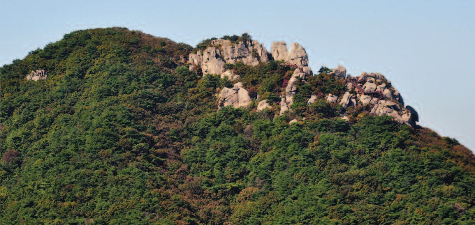 오른쪽으로 호국사를 바라보며 좌우 어느 쪽을 보아도 절벽 같은 비탈뿐인 능선은 마사토인데다 경사도 심하다. 주변은 굵은 소나무 사이사이에 키 큰 산철쭉이 빈자리를 메우고 있다. 5분 만에 큰 바위를 돌아 올라서면 쉼터가 있고 3~4분 더 오르면 남산동과 구서동쪽이 잘 보이는 전망대 바위가 기다린다. 소나무가 줄어들고 철쭉을 비롯한 잡목이 늘어나는 능선을 5분가량 오르면 마사토 비탈길이다. 얼른 보면 미끄러지기 쉬울 것 같지만 올라보면 꼭 그렇지도 않다.