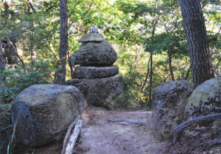 네거리에서 5분정도 걸으면 바위지대가 시작된다. 바위를 넘든 우회하든 각자의 등산 능력에 따라 선택해야 하지만 바위를 넘는 것이 훨씬 등산의 재미를 더한다. 바위사이를 지나 바위 위로 오르는 길에는 로프가 걸려 있다. 왼편의 우회로를 버리고 그대로 오르면 전망대 바위다. 앞에는 3개의 바위가 포개어진 층층바위가 있다.