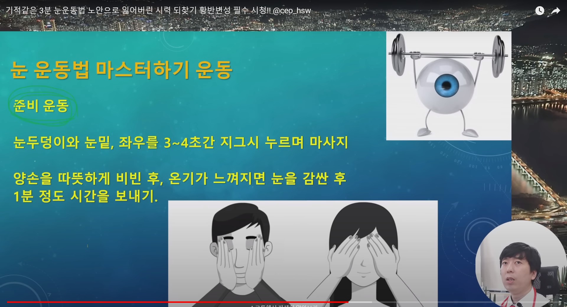 1. 준비운동 - 눈두덩이와 눈밑 좌우를 3~4초가 누르면 마사지. 양손을 비벼서 따뜻해지면 눈을 감싼 후 1분 정도 지속하기.