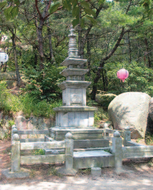이정표가 가리키는 대로 바로 오르기를 2분이면 119위치표지목 11-1번이 서있다. 칠성암까지 150m라고 하지만 급경사여서 6~7분은 걸린다. 법당 앞에서 왼쪽의 산으로 오르면 오른쪽에 119위치표지목 111번이 서 있다. 표지목 쪽으로 올라가도 되지만 조금 험하다. 왼쪽으로 30m가서 바위 사이를 지나 능선에 올라서면 조그마한 석탑 1기가 서있다.