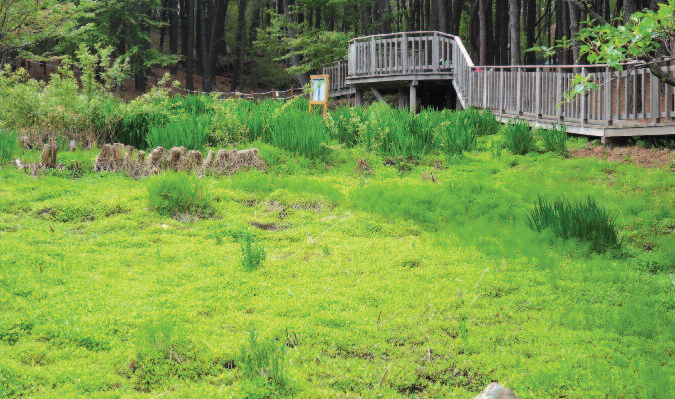 습지와 오른쪽 구민의 숲 사이로 계속 가면 체육공원을 지나 아무르산 개구리를 볼 수 있는 습지에 닿는다. 입춘이 지나 얼음이 녹고 물의 온도가 높아가는 우수가 되면 아무르산 개구리의 울음소리를 들으며 알을 볼 수 있는 습지 바로 옆이 금정산 주능 등산로다.