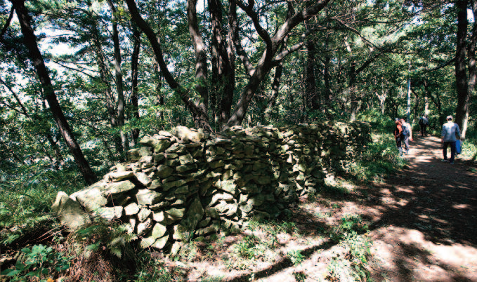 의 케른이 서 있고 바로 위에는 갈림길이다. 왼편은 쌍무덤 옆으로 직진하게 되고 오른쪽이 조금 둘러가는 길이다. 갈라졌던 길이 다시 만난 다음에는 가파른 돌길로 오른다. 산허리를 돌면서 오른쪽으로 보탑사에서 올라오는 길과 마주친다. 산비탈에 걸린 편안한 길을 2~3분 걸어 계곡을 건넌다.