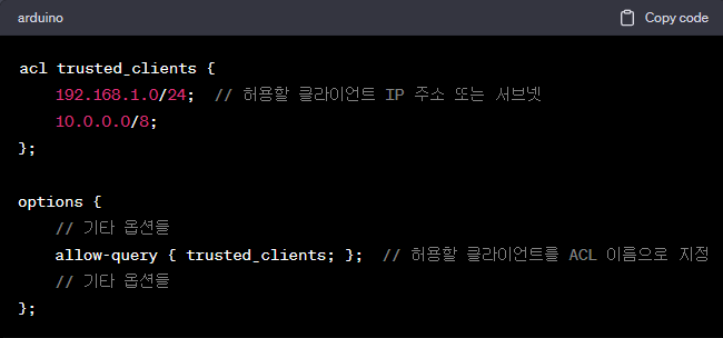 위 예제에서는 'trusted_clients'라는 ACL에 속한 클라이언트만 쿼리를 허용하도록 설정하고 있습니다. ACL 이름은 사용자 정의 가능하며, 허용할 IP 주소 또는 서브넷은 필요에 따라 변경할 수 있습니다.