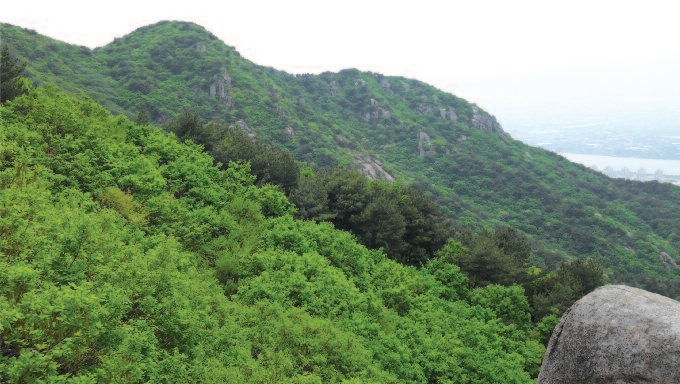 채소밭 옆으로 30m가량 오르면 바로 솔밭 속의 된비알이다. 3~4분 뒤 이마에 땀이 밸 즈음이면 왼편에 송전철탑, 오른쪽 아래에 계단식 채전이 보이면서 평지길이다. 얼마 안 가 오른쪽 갈림길 이 나오지만 무시하고 그대로 가면 곧 오르막이 시작된다.