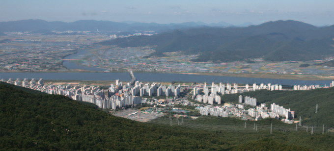 조금 쉬었으면 할 만큼 지칠 때쯤 소나무지대가 잡목이 많아지면서 등산로 오른쪽에 소나무 그늘 아래 혼자 쉬기 알맞은 전망대가 있다. 낙동강 건너 대저일대가 훤히 내려다보인다. 잠깐 쉰 다음
