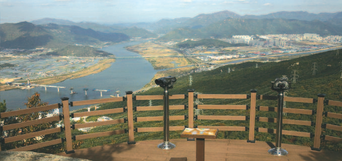 문처럼 생긴 바위사이를 지난다. 왼쪽으로 119위치 표지목 254번 이정표가 있는 갈림길이 나오면서 고당봉으로 가는 길이 열려있다. 오른쪽으로 3분정도 바위를 돌아 오르면 전망대를 겸한 쉼터다. 낙동강과 물금 양산 쪽이 훤히 내려다보인다.