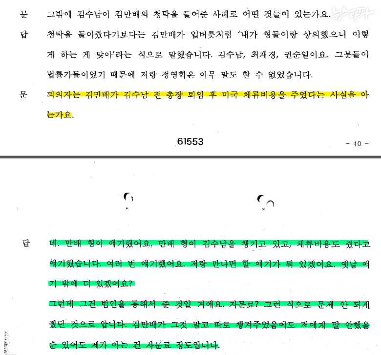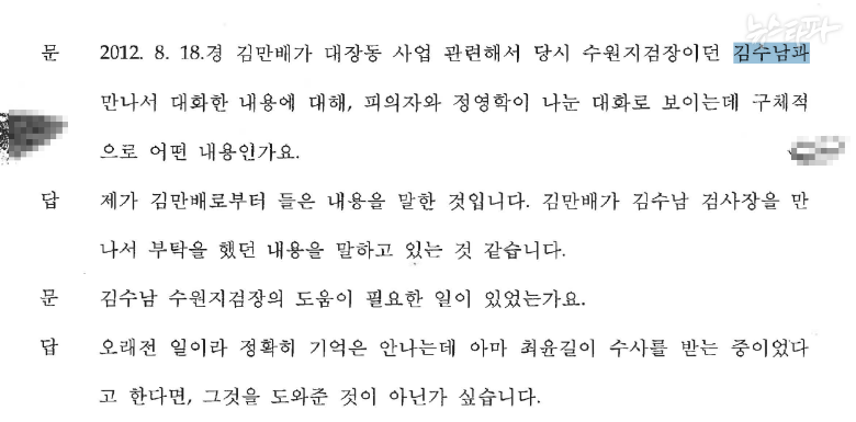 여기서 주목할 점은 '미국 체류비'와 관련해 검사가 먼저 물었단 것이다. 검사의 질문에는 김만배가 체류비를 줬다는 '사실'이란 단정적인 표현이 들어 있다. 즉, 검사는 김수남의 미국 체류비와 관련해 사전에 정보를 파악하고 있었고, 이를 다시 남욱에게 물어서 재차 확인한 것이다.