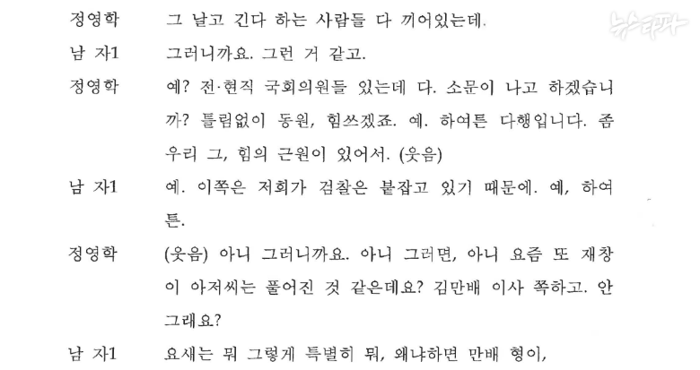 ▲정영학 녹취록(2012.8.18). 검찰청 속기사가 정영학 녹음파일을 직접 듣고 기록한 '검찰 버전' 녹취록이다. 남자1은 남욱 변호사를 뜻한다. 기존에 뉴스타파가 공개한 녹취록은 정영학 회계사가 작성했는데, 녹음파일 일부 내용은 실려있지 않다.