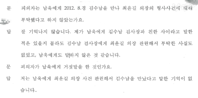 김만배는 2022년 10월 3일 검찰 조사에서 위 녹음파일과 관련된 진술을 했다. 이날 검사가 "피의자는 남욱에게 2012.8 경 김수남을 만나 최윤길 의장의 형사 사건에 대해 부탁했다고 하지 않았는가요?"라고 묻자, 김만배는 "잘 기억나지 않습니다. 제가 김수남 검사장과 친한 사이라고 말한 적은 있을지 몰라도, 김수남 검사장에게 최윤길 의장 관련해서 부탁한 사실도 없었고, 남욱에게도 말하지 않은 것 같습니다"라고 답했다. 청탁 사실을 부인한 것이다.