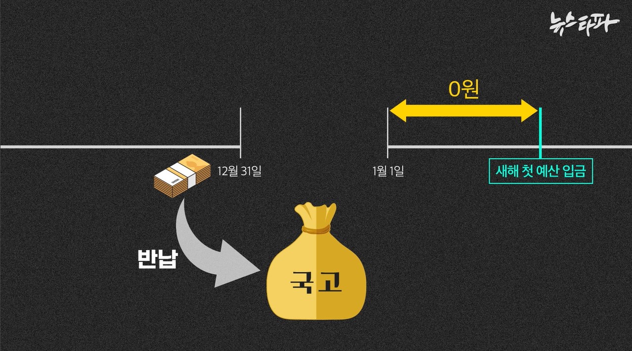 국가재정법 3조는 ‘회계연도 독립의 원칙’을 규정하고 있다. 이에 따라 모든 정부기관은 한 회계연도가 끝나는 12월 31일까지 다 쓰지 못 한 예산을 국고에 반납하고, 새해에는 새 예산을 받아 써야 한다. 매년 1월 새해 첫 예산이 입금되기 전까지 원칙적으로 모든 정부기관에게는 쓸 수 있는 현금이 없다.