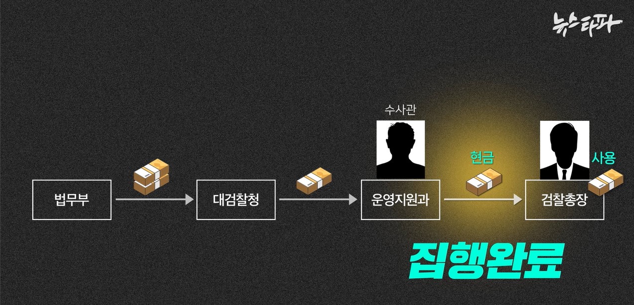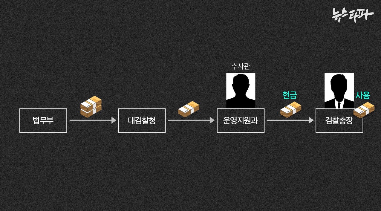 ① 특수활동비 예산은 매달 법무부에서 대검찰청으로 내려온다 → ② 이 돈의 절반 정도는 다시 대검찰청의 운영지원과 계좌로 입금된다 → ③ 운영지원과 소속 수사관(관서운영경비출납공무원)은 계좌에 있는 특수활동비를 현금으로 찾아 검찰총장에게 갖다준다 → ④ 총장은 이 현금을 보관하다가 그때그때 필요에 따라 사용한다.