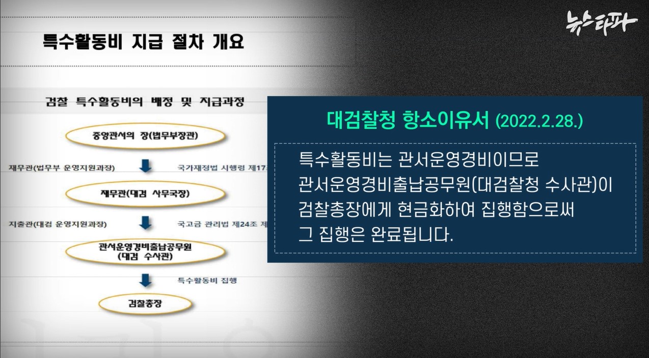 당시 검찰은 ‘특수활동비 지급 절차 개요’라는 도표를 제시하면서 “특수활동비는 관서운영경비출납공무원(대검찰청 수사관)이 검찰총장에게 현금화하여 집행함으로써 그 집행은 완료된다”고 주장했다.