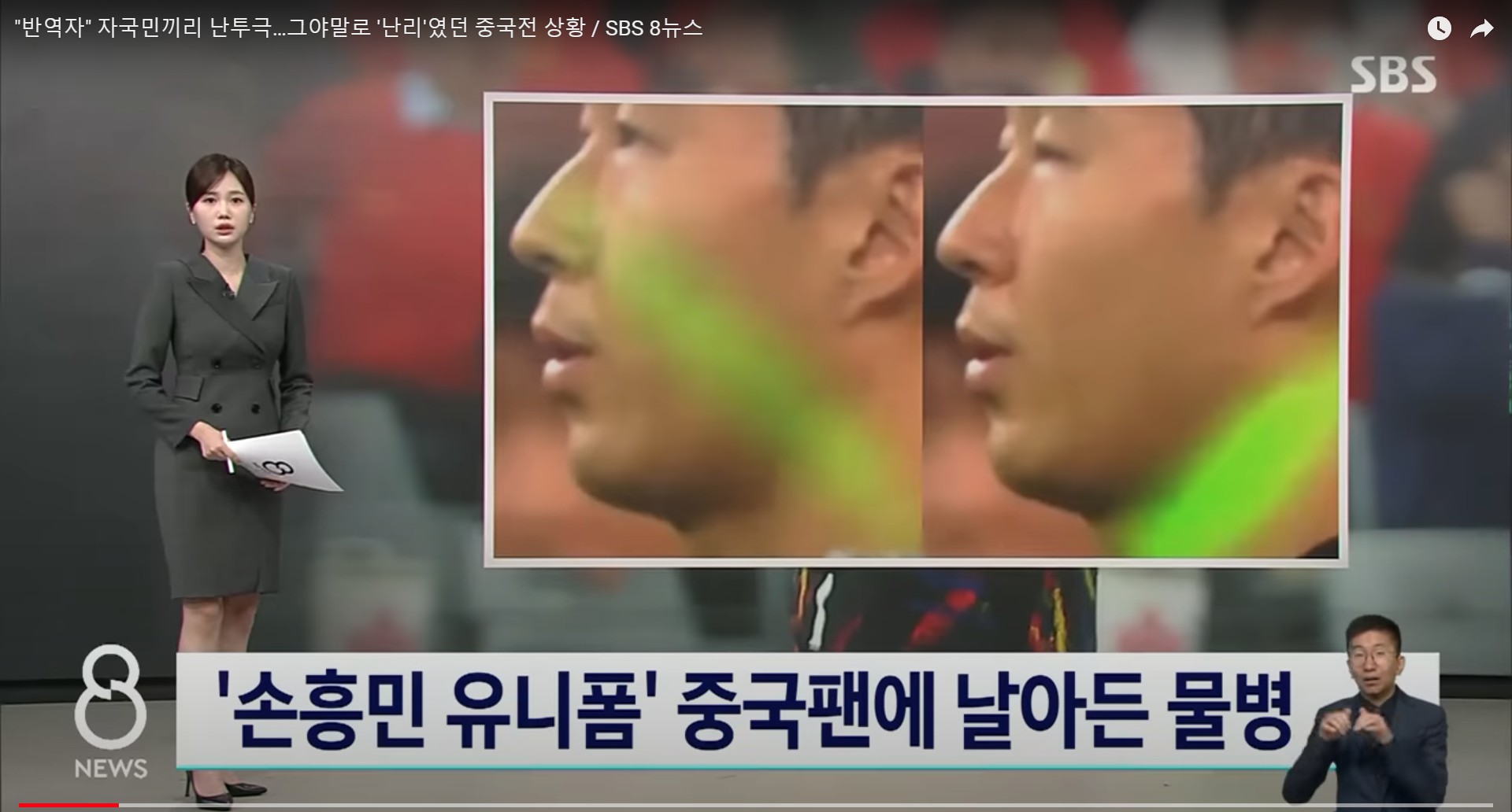 우리 축구 대표팀이 어제(21일) 월드컵 예선에서 중국을 3대 0으로 물리쳤습니다. 그런데 홈팀인 중국 관중석에서는 경기 내내 눈살을 찌푸리게 하는 장면이 이어졌는데요, 한국 선수를 향해 레이저를 쏘는가 하면 손흥민 선수 유니폼을 입은 중국 팬들에게 야유와 함께 물병을 던지기도 했습니다.