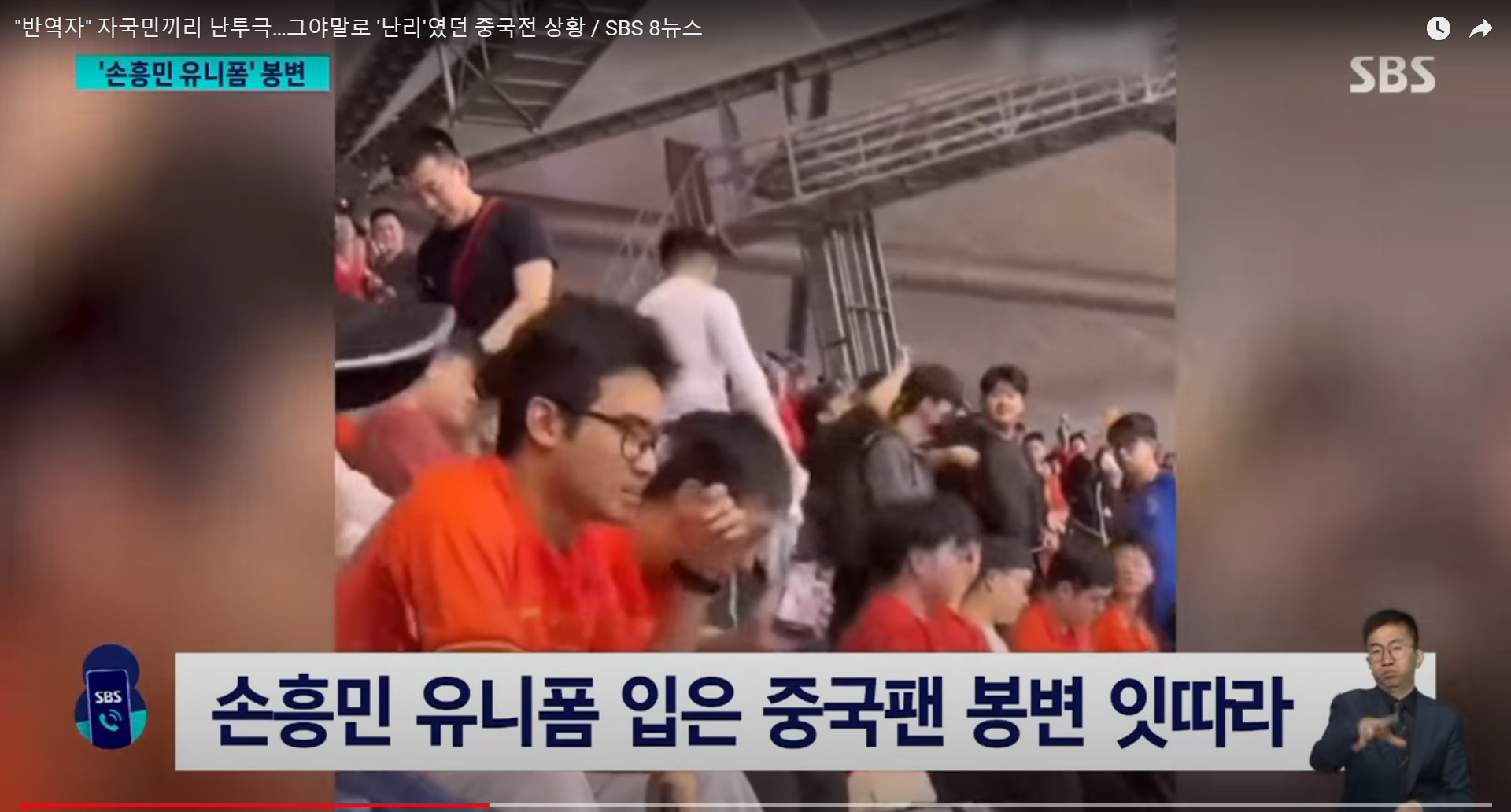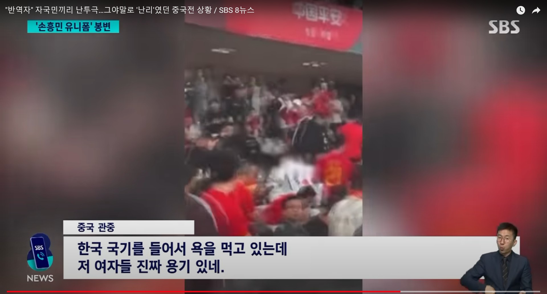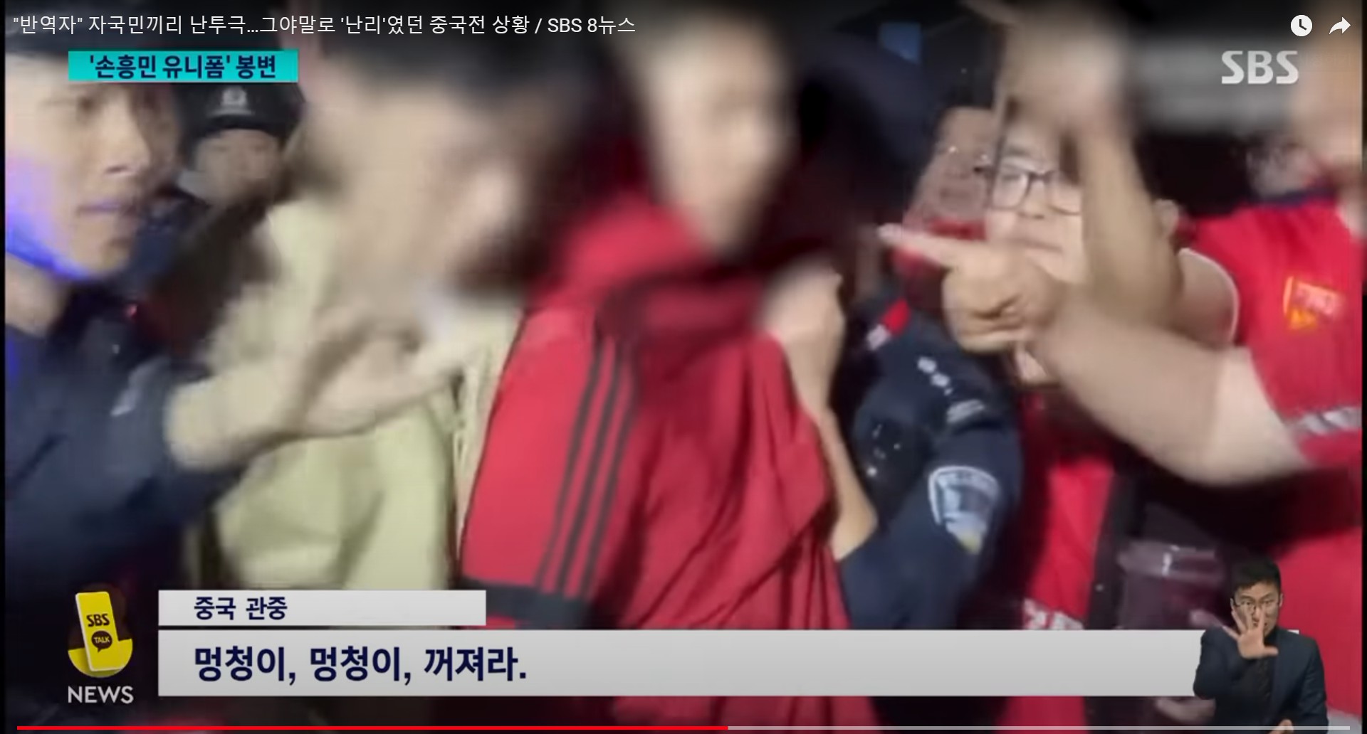 [중국 관중 : 무슨 낯짝으로 중국팀 관중석에서 상대방 유니폼을 입고 있냐.]