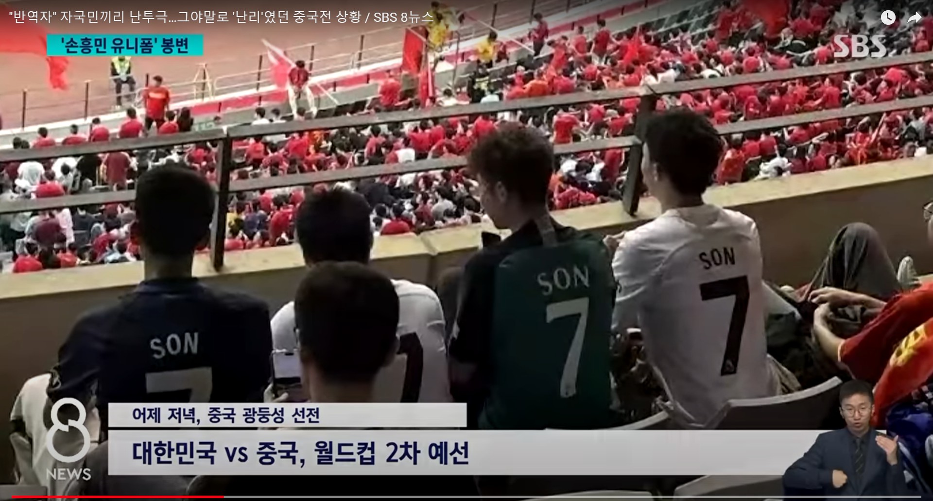 붉은색 일색인 월드컵 예선 한중전 관람석 곳곳에 손흥민 선수의 토트넘 유니폼을 입은 중국 팬들이 눈에 띕니다.
